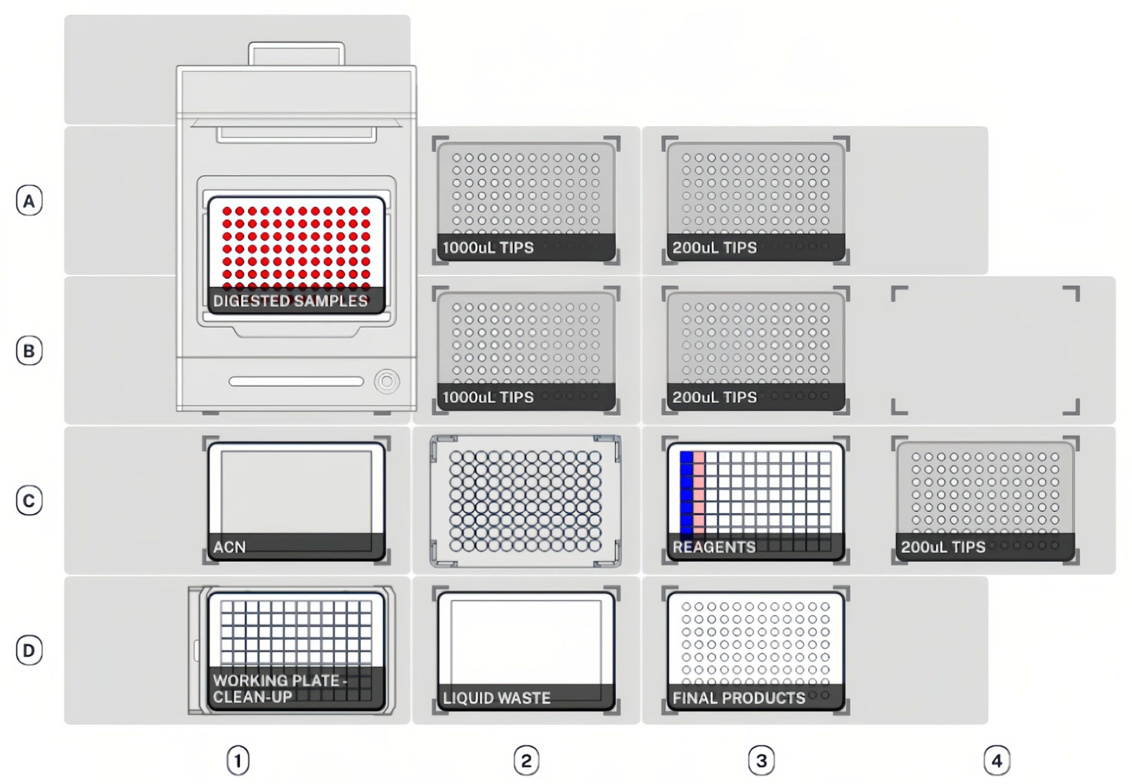 圖 2. Opentrons Flex自動(dòng)化蛋白質(zhì)酶解與純化的甲板布局示意圖