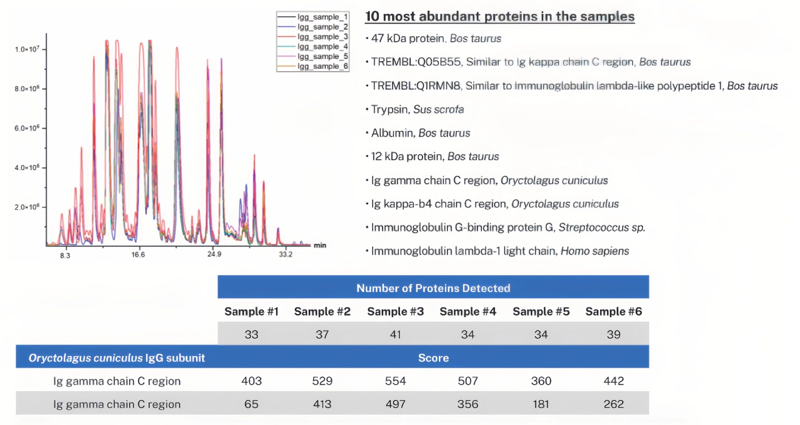 蛋白質(zhì)酶解完成后,Opentrons Flex 即刻執(zhí)行了自動(dòng)化 SP3 脫鹽方案。簡(jiǎn)言之,酶解后樣本從熱循環(huán)模塊轉(zhuǎn)移至熱振蕩模塊上的新工作板中,并與10 μL磁珠懸液(Cytiva Sera-Mag 羧基修飾磁珠;50 μg/μL)及乙腈(ACN, 1292 μL)混合以實(shí)現(xiàn)肽段捕獲。通過磁分離收集磁珠,隨后使用ACN(1000 μL)進(jìn)行洗滌。肽段在2% DMSO(80 μL)中被洗脫。最終產(chǎn)物在儀器外進(jìn)行真空干燥。LC-MS 分析顯示,在各樣品間基峰離子色譜圖模式高度一致,并且能夠可靠地檢測(cè)到與兔 IgG 亞基相關(guān)的蛋白質(zhì)。(圖3)。