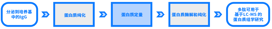 樣品中目標(biāo)蛋白的純化與鑒定是蛋白質(zhì)組學(xué)研究的基石。蛋白質(zhì)分離后,總蛋白的濃度定量與均一化處理可為后續(xù)液相色譜-質(zhì)譜(LC-MS)分析的樣品酶解及純化步驟建立基準(zhǔn)(圖1)。使用自動(dòng)化設(shè)備完成這些必要步驟中的重復(fù)移液操作,可顯著提升實(shí)驗(yàn)通量并為研究人員節(jié)省寶貴時(shí)間。本研究作為自下而上蛋白質(zhì)組學(xué)完整工作流程的關(guān)鍵環(huán)節(jié),采用 Opentrons Flex 自動(dòng)化移液工作站的兩套流程,實(shí)現(xiàn)了已純化的單克隆抗體的自動(dòng)化定量與均一化處理。