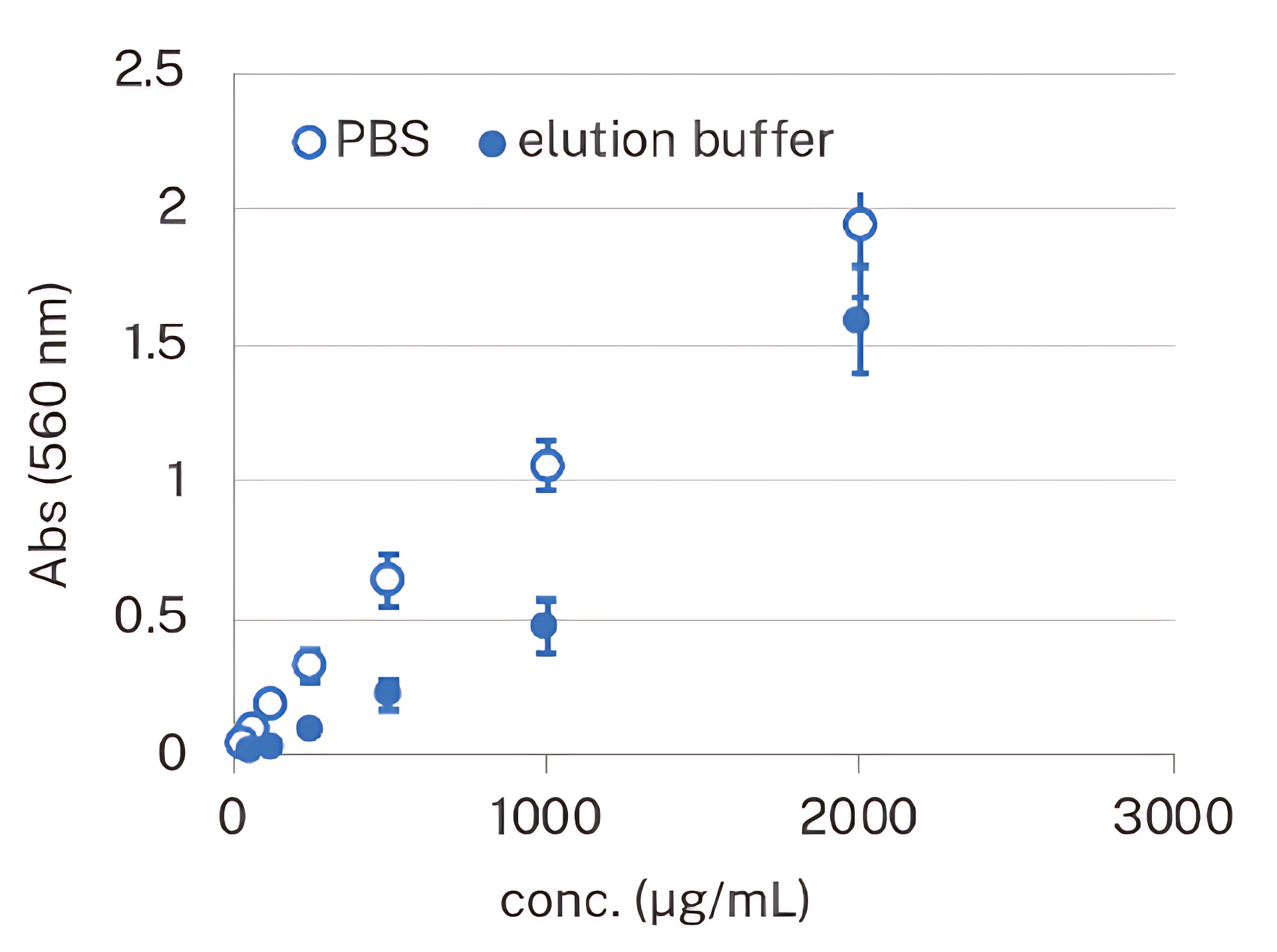 實(shí)驗(yàn)首先采用牛血清白蛋白(BSA)在PBS或洗脫緩沖液中進(jìn)行連續(xù)兩倍梯度稀釋?zhuān)ㄗ髨D,起始濃度:2000 μg/mL, n=4)以建立標(biāo)準(zhǔn)曲線,隨后將各樣本的吸光度值擬合至該標(biāo)準(zhǔn)曲線(右圖,n=6)