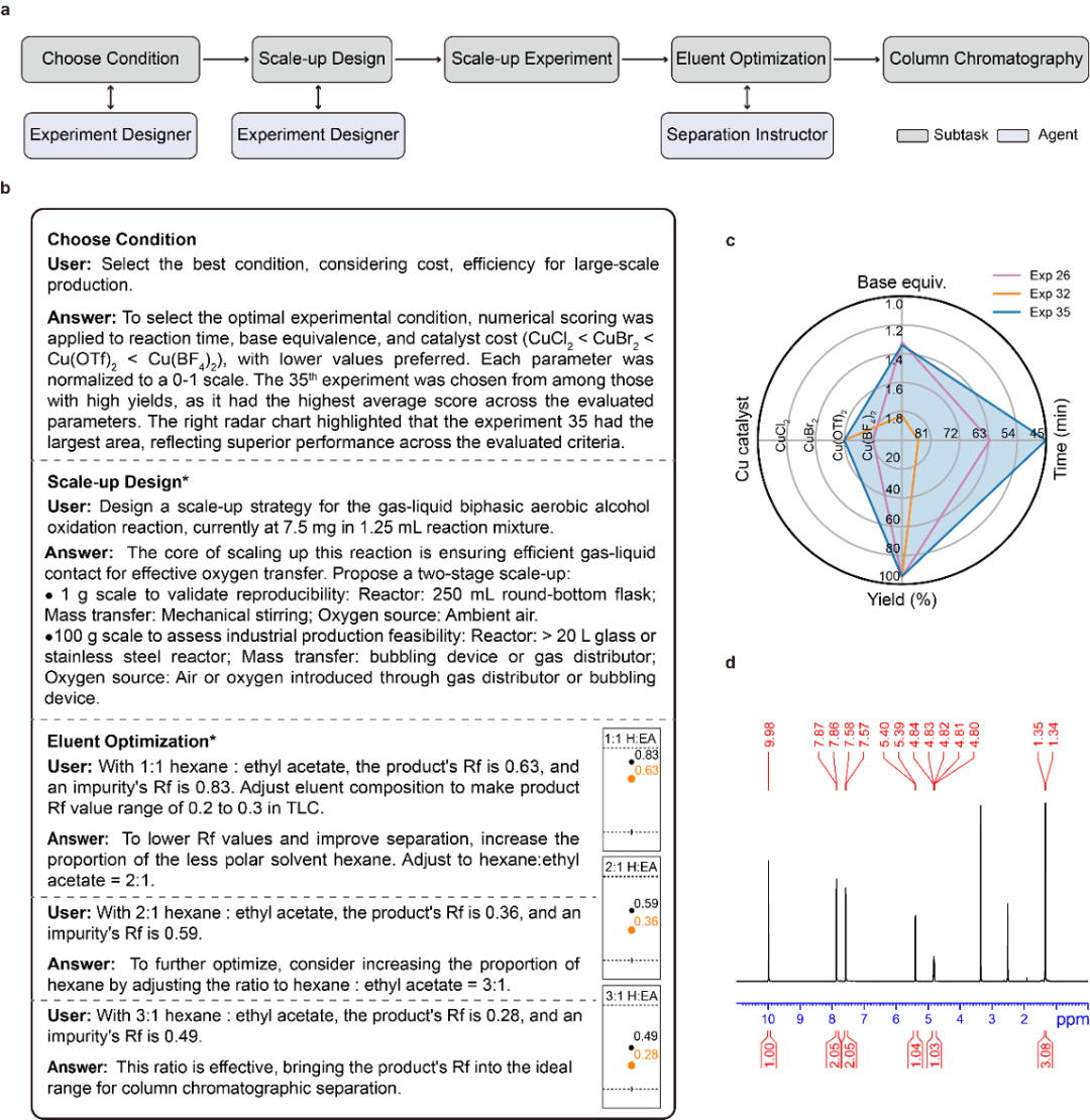 基于前期優(yōu)化的高產(chǎn)率條件,由Experiment Designer選擇了第35次實驗的條件(反應(yīng)時間45分鐘、催化劑Cu(OTf)?、1.34當(dāng)量的堿DBU)進行規(guī)模放大(圖5c)。隨后,Experiment Designer提出了逐級放大策略:先在1 g規(guī)模驗證反應(yīng)的可重復(fù)性和穩(wěn)定性,再擴展至100 g規(guī)模評估工業(yè)生產(chǎn)可行性,其中強調(diào)了氣液兩相有效接觸和充足氧氣供應(yīng)的重要性,并精確計算了試劑配比,研究人員隨后基于此進行了1 g規(guī)模的放大實驗。純化階段,Separation Instructor經(jīng)兩輪決策后確定洗脫液比例為正己烷:乙酸乙酯=3:1,此條件下目標(biāo)產(chǎn)物12p的Rf值為0.28,雜質(zhì)的Rf值為0.49,達到有效分離(圖5b)。最終,使用自動過柱機分離得到915 mg產(chǎn)品,純度>98%,分離收率為86%(圖5d)。