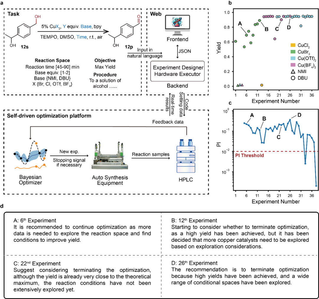 該研究團隊同時對二元醇底物12s進行了反應(yīng)條件優(yōu)化,以最大化反應(yīng)收率。通過網(wǎng)頁界面以自然語言描述優(yōu)化任務(wù)后,Experiment Designer和Hardware Executor智能體將信息轉(zhuǎn)化為結(jié)構(gòu)化數(shù)據(jù),并傳遞至自驅(qū)動優(yōu)化平臺。該平臺由貝葉斯優(yōu)化器、自動化合成設(shè)備和HPLC組成,分別負(fù)責(zé)提出新反應(yīng)條件、執(zhí)行實驗和分析結(jié)果,實時優(yōu)化進展會顯示在網(wǎng)頁界面中供用戶查看(圖4a)。優(yōu)化過程中采用了基于PI準(zhǔn)則(計算新條件是否可能成為最優(yōu)條件的可能性)的停止策略。在36次實驗后,PI停止準(zhǔn)則被滿足,找到了多個高收率反應(yīng)條件(圖4b-c)。同時Result Interpreter在第26次實驗后建議終止,其指出反應(yīng)收率已接近理論最大值,且反應(yīng)空間探索已充分。如按此建議終止可減少10次實驗,且優(yōu)化結(jié)果無明顯差異(圖4d)。這表明Result Interpreter在優(yōu)化過程中有效平衡了探索和利用(exploration and exploitation),體現(xiàn)出了其決策的合理性。
